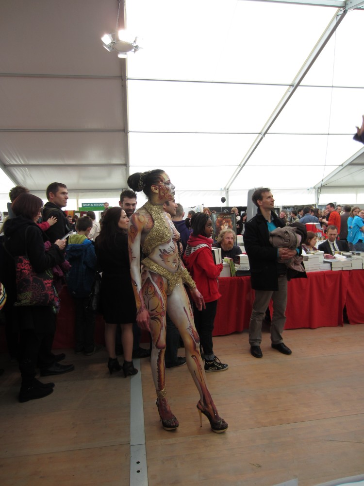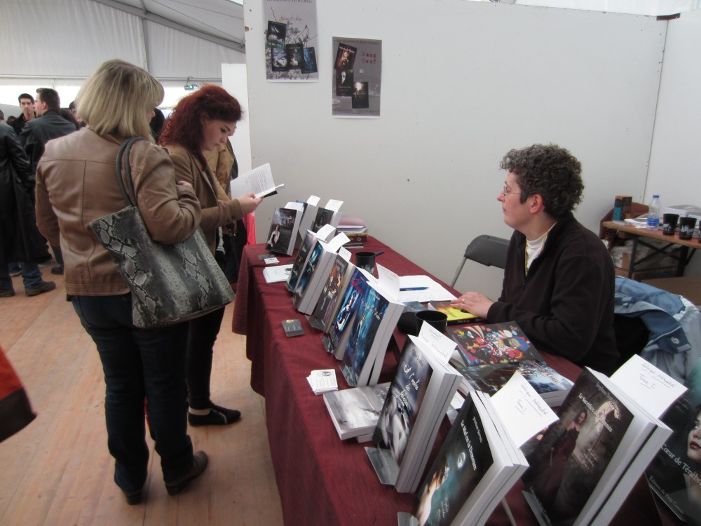 Malgré le froid et la pluie (pulls et écharpes en plein mai : la classe, non ?), notre premier salon a été une réussite, notamment sur le plan humain. Mais nous avons aussi vendu assez pour rembourser tous les frais engagés (et même plus !). Beaucoup de rencontres avec des éditeurs, auteurs, lecteurs, blogueurs et autres -eurs de tout poil (et on a même vu des soldats napoléoniens, des monstres, une bibliothécaire guerrière armée d’une hache et des vampires, si si !). Quelques originaux aussi, comme cette dame qui se demandait ce qui se passait sous la bulle des livres des Imaginales et qui, après nous avoir soumis à la Question, nous lança un « j’aime pas le fantastique-fantasy » avant de poursuivre sa route d’un air suspicieux (nous n’en doutons pas : elle n’aura pas été déçue de sa visite au salon !). Nous remercions tout particulièrement Lydie Blaizot, Stéphane Soutoul, Vanessa Terral et Cécile Duquenne pour le temps qu’ils ont passé sur notre stand à dédicacer, promouvoir ou juste discuter, sans parler de tous ceux qui sont venus nous voir une ou plusieurs fois (Marika Gallman, Fleurine, Cécilia Correia, Astrid Lafleur, Sklaerenn Baron, Estelle Faye, Alain Sprauel, etc.) ! Au final, ces quatre jours étaient bien trop courts !